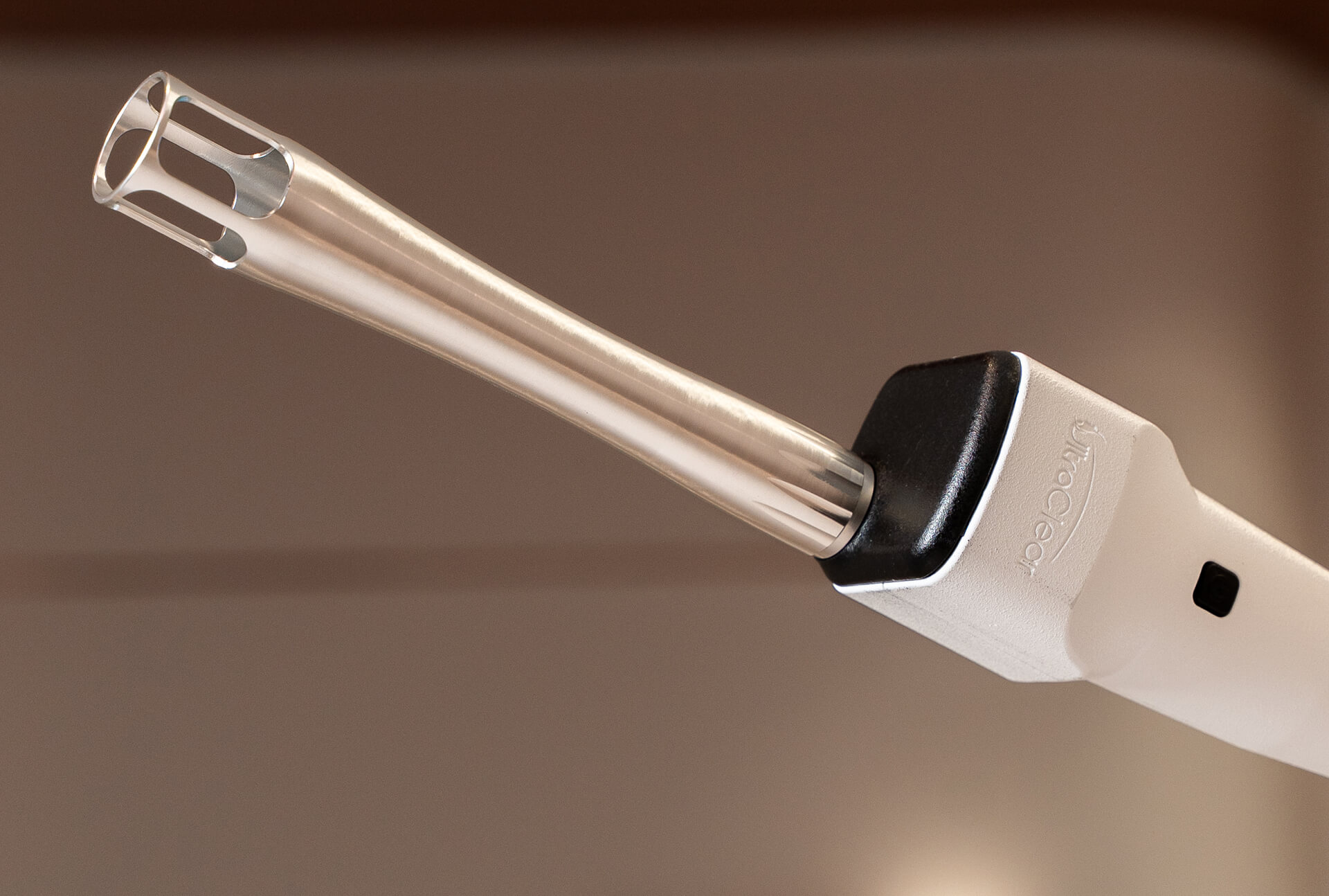 - The UltraClear laser device is placed against the skin and moved to the target areas.